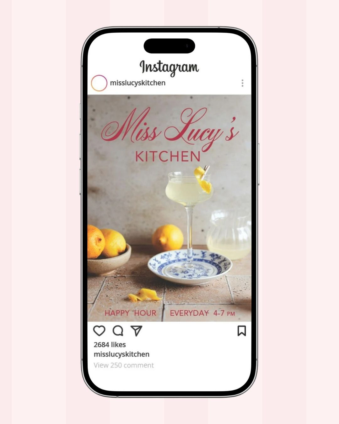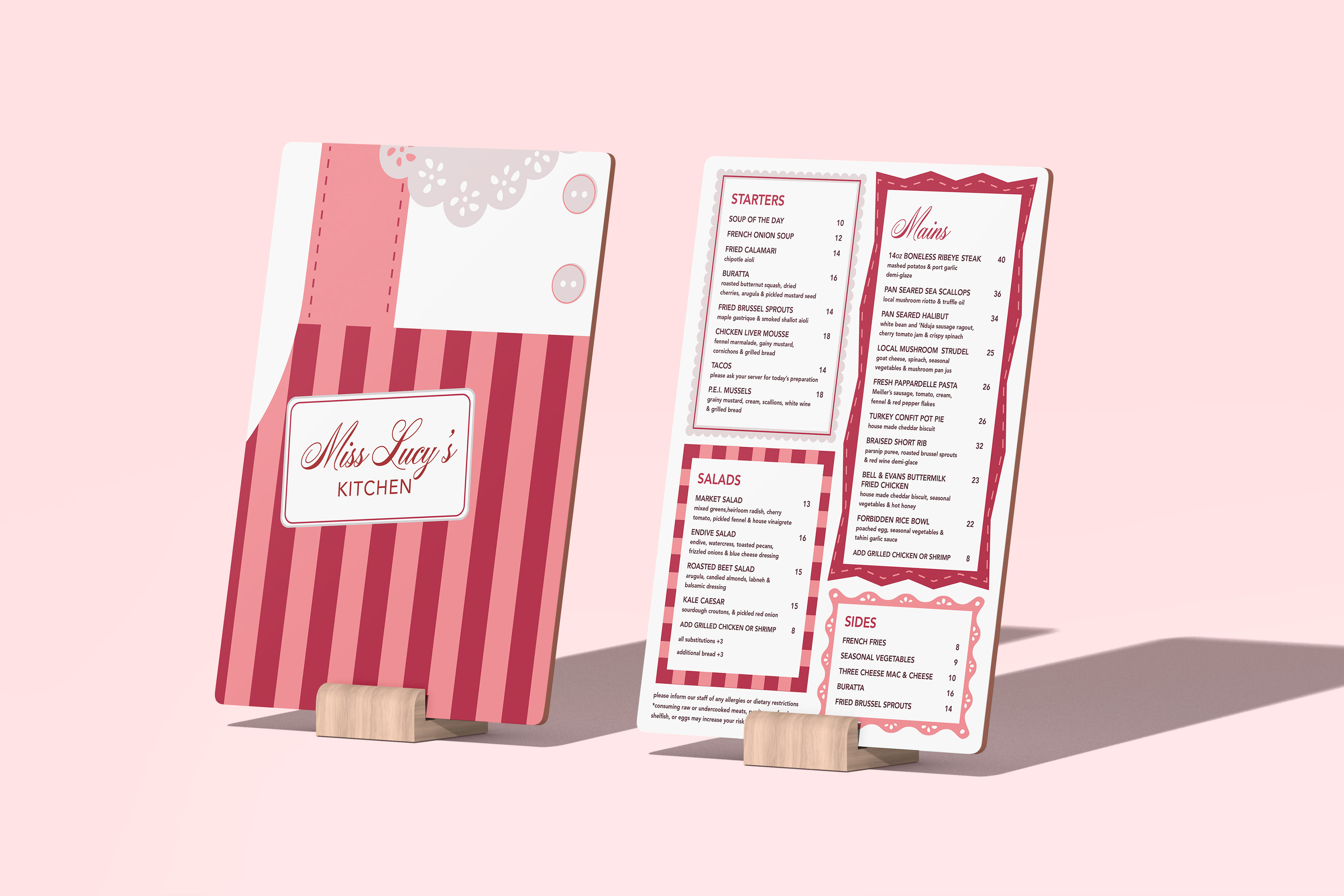 The design system is built around a rosy, feminine palette of blush and deep rose, with candy-stripe patterns and eyelet lace details that nod to a grandmother's kitchen without feeling dated. The logo pairs a flowing calligraphic script for Miss Lucy's with a clean, grounded serif for KITCHEN, creating a hierarchy that feels both elegant and approachable. The apron-shaped menu cover is the centerpiece of the identity, a literal and visual metaphor for home cooking elevated to a dining experience.